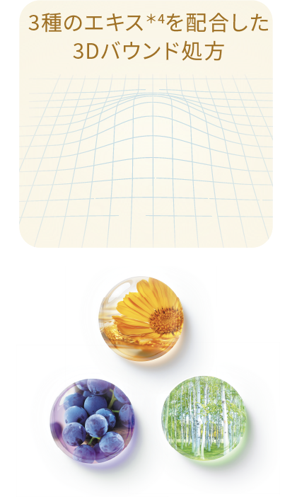 *1 独自の3種のエキスを配合したハリを感じられる処方設計 *2 3種成分によるアプローチのこと *3 加水分解コラーゲン、水溶性コラーゲン、ヒアルロン酸Na、コンドロイチン硫酸Na、BG(保湿) *4 トウキンセンカ花エキス、ワインエキス、シラカンバ樹皮エキス、BG(保湿)