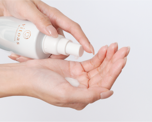 洗顔のあと、手のひらにポンプ2プッシュ程度の量をたっぷりと出してください。