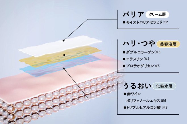 ※動画・画像はイメージ図です ※1 W/O/W構造中の美容液ークリーム層 ※2 N-ステアロイルフィトスフィンゴシン、ヒドロキシステアリルフィトスフィンゴシン、コメヌカスフィンゴ糖脂質(エモリエント) ※3 水溶性コラーゲン液N、コラーゲン・トリペプチド F、1,3ーブチレングリコール(保湿) ※4 ブリエラスチン、1,3ーブチレングリコール(保湿) ※5 水溶性プロテオグリカン溶液S、1,3ーブチレングリコール(保湿) ※6 赤ワイン(カベルネ・ソーヴィニヨン)抽出物、1,3-ブチレングリコール(保湿) ※7 加水分解ヒアルロン酸、ヒアルロン酸ナトリウム(2)、アセチル化ヒアルロン酸ナトリウム、1,3ーブチレングリコール(保湿)