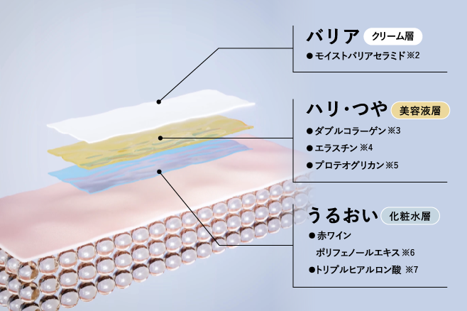 ※動画・画像はイメージ図です *各成分はマイパーフェクションの場合 ※1 W/O/W構造中の美容液ークリーム層 ※2 ワインエキス、BG(保湿) ※3 加水分解ヒアルロン酸、ヒアルロン酸Na、アセチルヒアルロン酸Na、グリセリン(保湿) ※4 水溶性コラーゲン、加水分解コラーゲン、BG(保湿) ※5 水溶性プロテオグリカン、BG(保湿) ※6 エラスチン、BG(保湿) ※7 セラミドNP、セラミドAP、スフィンゴ糖脂質(エモリエント)