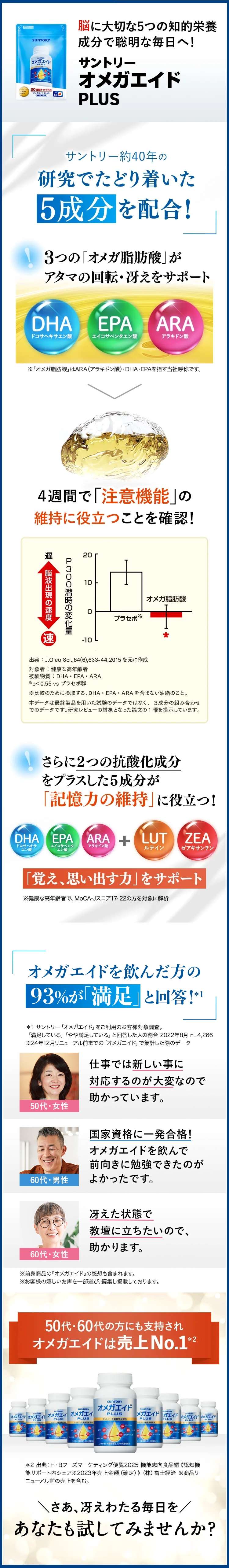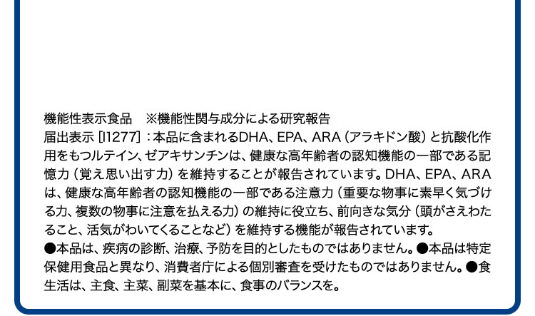届出表示[I1277]:本品に含まれるDHA、EPA、ARA(アラキドン酸)と抗酸化作用をもつルテイン、ゼアキサンチンは、健康な高年齢者の認知機能の一部である記憶力(覚え思い出す力)を維持することが報告されています。DHA、EPA、ARAは、健康な高年齢者の認知機能の一部である注意力(重要な物事に素早く気づける力、複数の物事に注意を払える力)の維持に役立ち、前向きな気分(頭がさえわたること、活気がわいてくることなど)を維持する機能が報告されています。