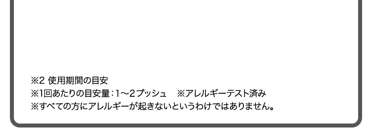 ●お肌に異常が生じていないかよく注意し、異常のある部位にはお使いにならないでください。●お肌に合わないとき(赤み・はれ・かゆみ・刺激・色抜け・白斑や黒ずみ等)は、ご使用をおやめください。