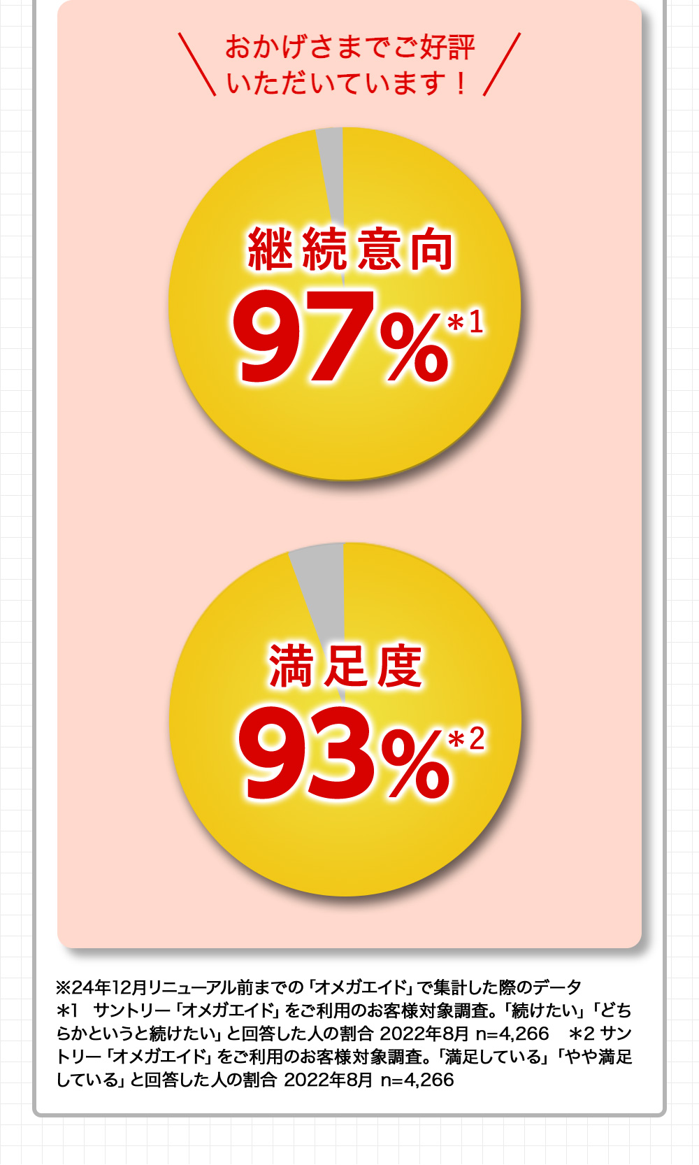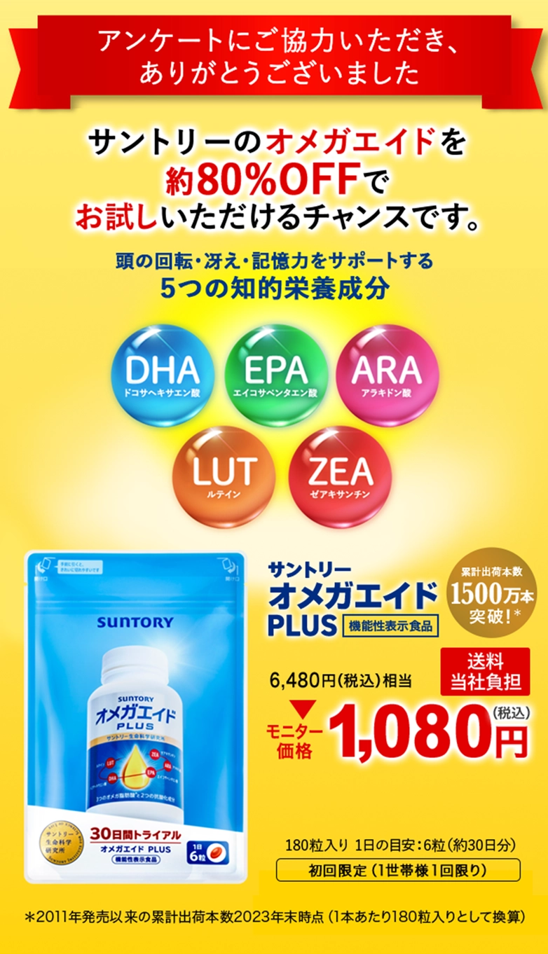 ※サントリー『オメガエイド』を「1,080円(税込)お試しキャンペーン」で初めてお試しになる方(1世帯様1回限り。)