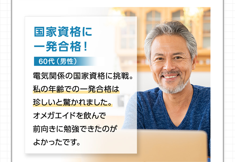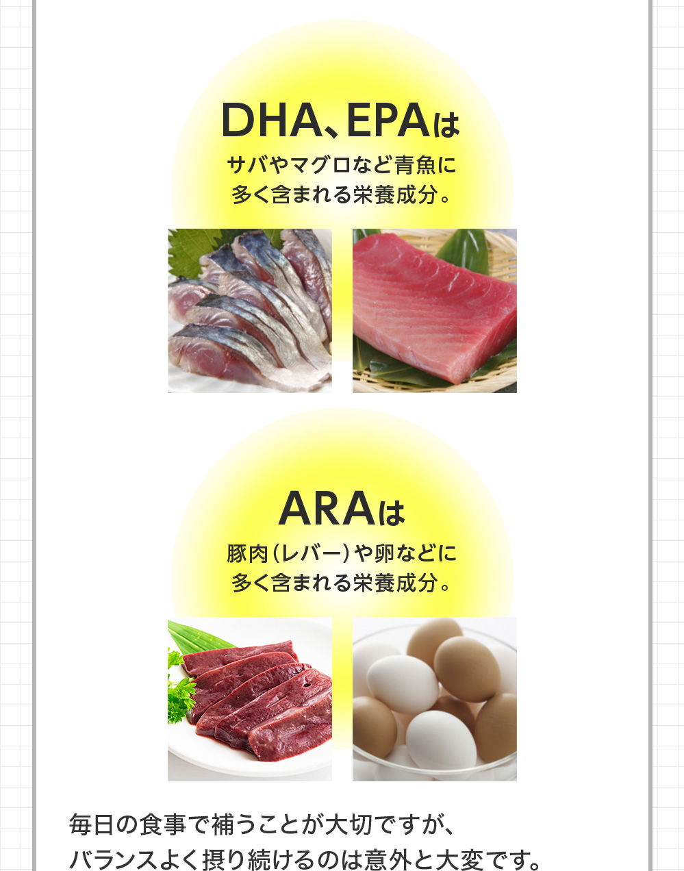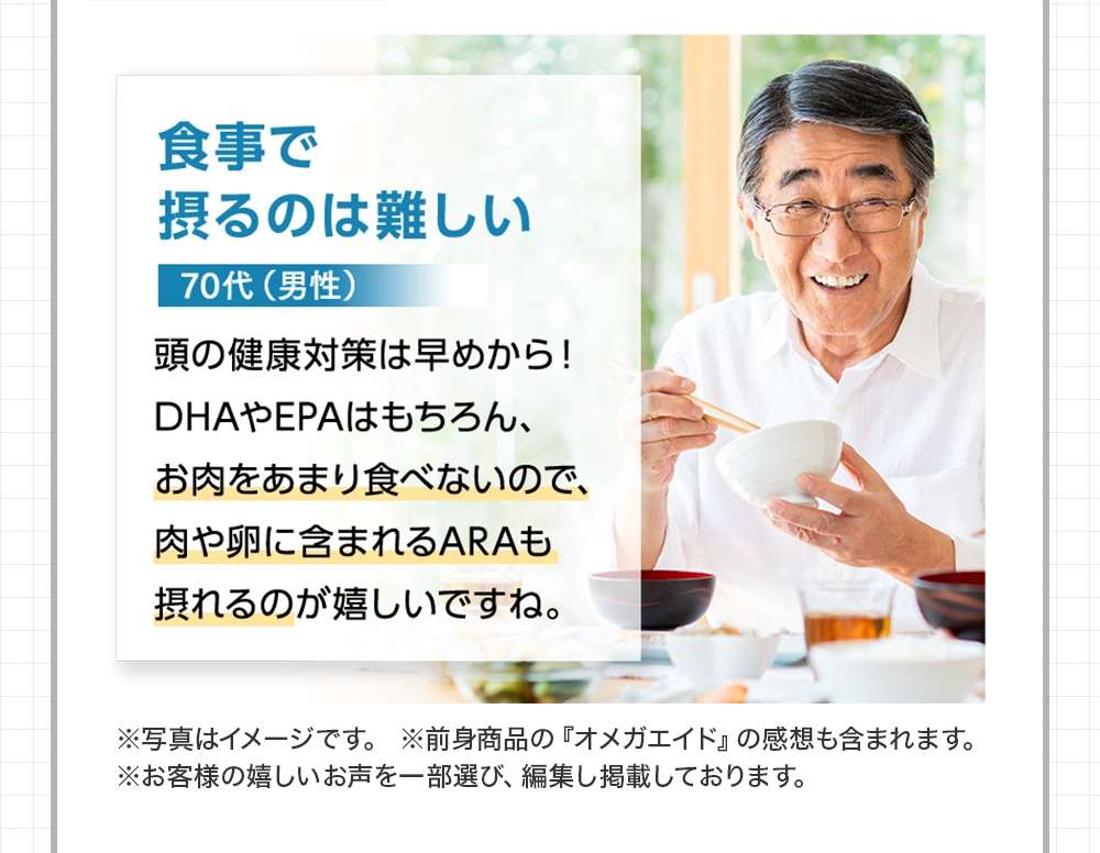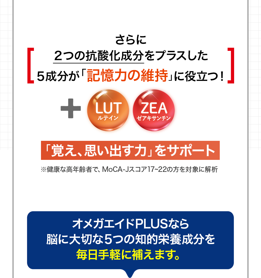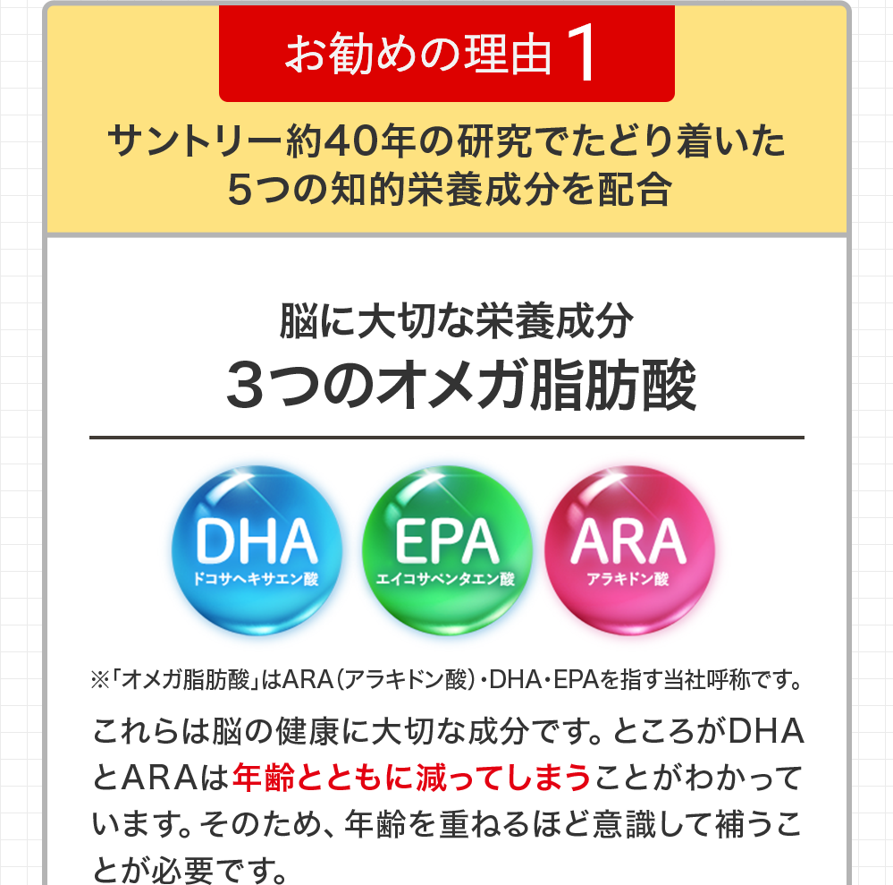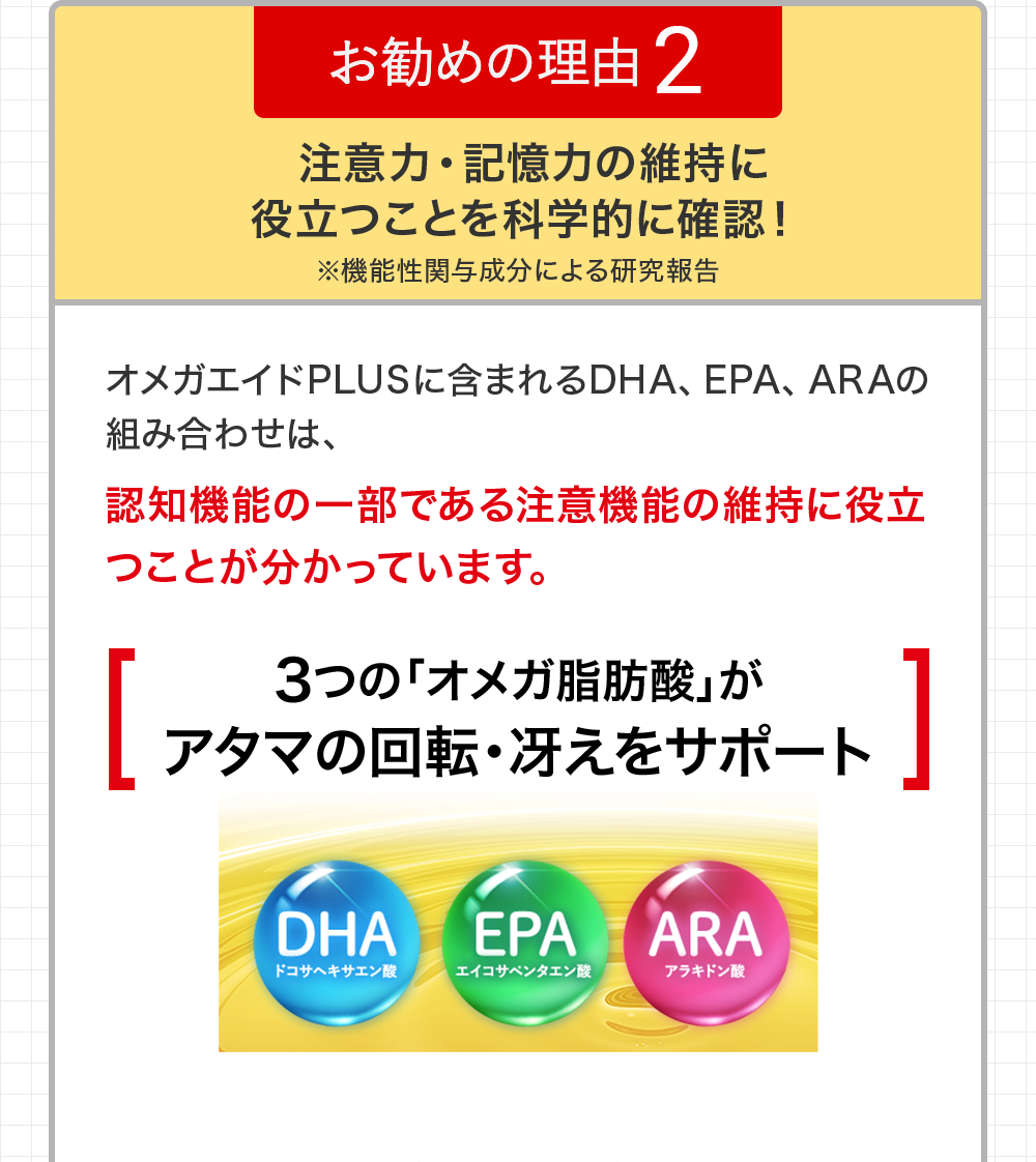 届出表示[I1277]:本品に含まれるDHA、EPA、ARA(アラキドン酸)と抗酸化作用をもつルテイン、ゼアキサンチンは、健康な高年齢者の認知機能の一部である記憶力(覚え思い出す力)を維持することが報告されています。DHA、EPA、ARAは、健康な高年齢者の認知機能の一部である注意力(重要な物事に素早く気づける力、複数の物事に注意を払える力)の維持に役立ち、前向きな気分(頭がさえわたること、活気がわいてくることなど)を維持する機能が報告されています。