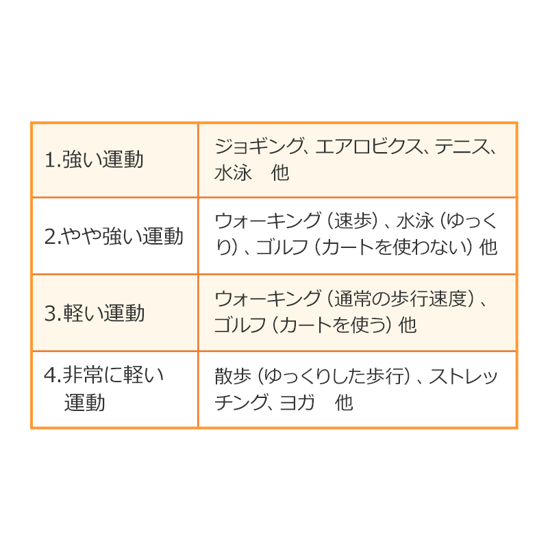 | 3.軽い運動 | ウォーキング(通常の歩行速度)、ゴルフ(カートを使う)他 |