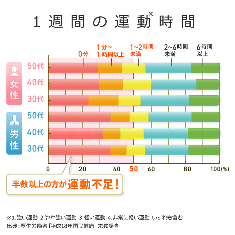 ダイエットの基本はヘルシーな食生活と適度な運動ですが、厚生労働省の調査によると、30~59歳男女の約半数以上が運動不足という結果が公表されています。