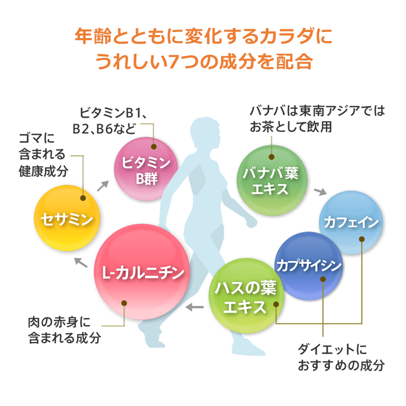 ダイエットメカニズムに基づいて、膨大なデータと試行錯誤の積み重ねにより厳選した、「L-カルニチン」、「カプサイシン」、「カフェイン」、「バナバ葉エキス」、「ハスの葉エキス」、「ビタミンB群」、そしてゴマの健康成分「セサミン」を配合。この7つのサポート成分がアクティブなカラダと生活を応援します!