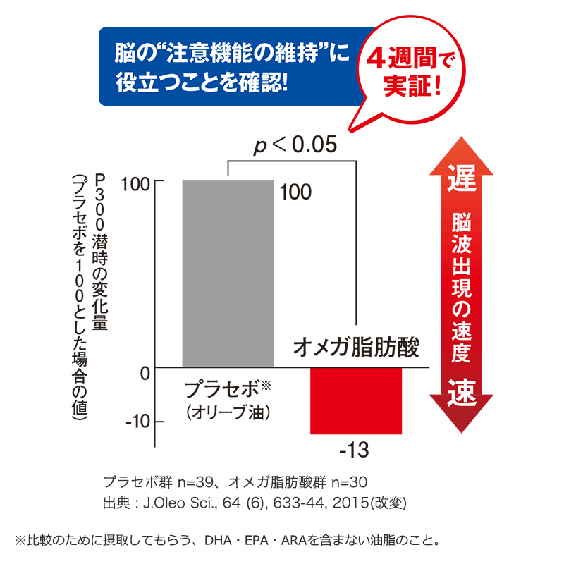 私たちサントリーの研究によって、『オメガエイド』に含まれるDHA、EPA、ARAを摂取することで、注意機能の指標となる"特定の脳波の出現速度"に対する有効性を確認。 つまり、“脳の注意機能の維持”に役立つことが実証されています。